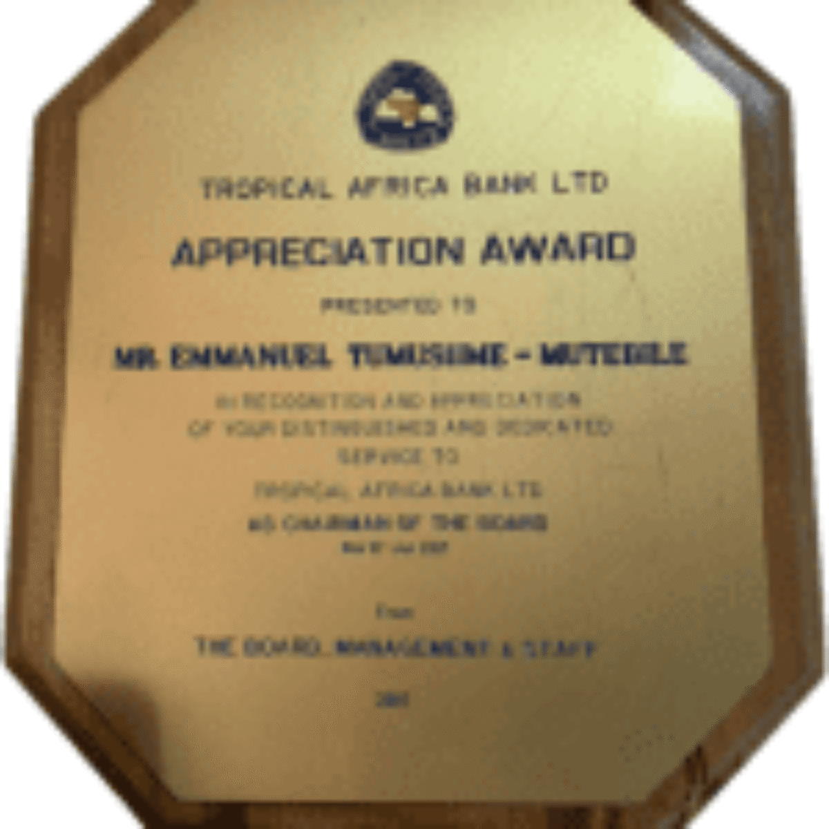 Tropical Bank of Africa Presented Appreciation Award to Prof Emmanuel Tumusiime Mutebile in Recognition and Appreciation of His distinguished and Dedicated Service To Tropical Bank of Africa Bank LTD as the Chairman of the Board.